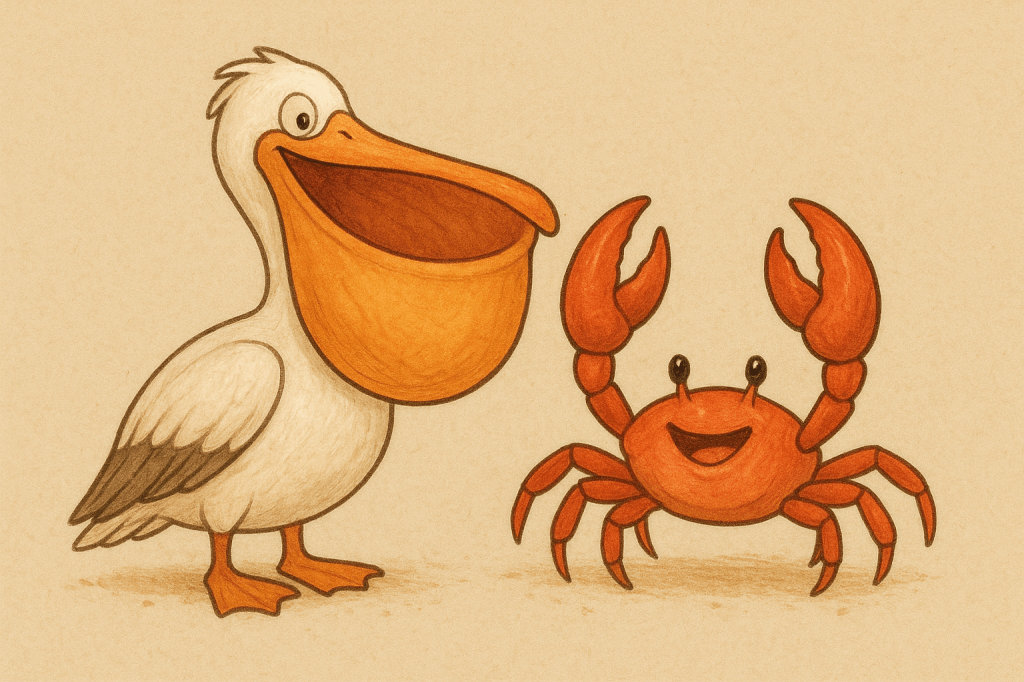 Il était une fois un jeune pélican qui vivait au-dessus des rochers. Chaque matin il allait dans la mer pour pêcher quelques poissons pour se nourrir avec son meilleur ami Sébastien le crabe . Ils se nourrissaient de sardines , d’huîtres , et de caviar. Ils buvaient l’eau de la mer et après le repas ils jouaient dehors et chantaient différentes chansons . Une fois qu’ils avaient terminé Sébastien rentrait chez lui.